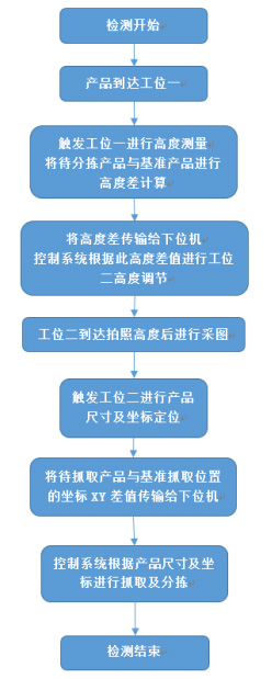 當產品到位后,第一工位先判斷產品高度,將待抓取產品高度與基準產品的高度差值進行計算后,傳輸給控制系統,控制系統通過升降第二工位的拍照位高度進行產品尺寸測量,將測量結果傳輸給控制系統進行分揀。